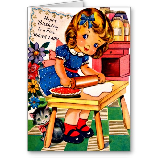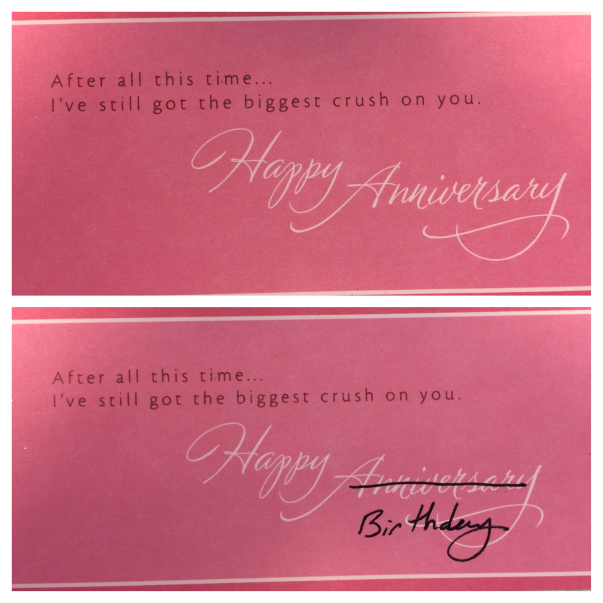 Take this week. This week marked her birthday. I had a great present in advance, but completely forgot the stupid card until the day of. So I put on my camo, blacked my eyes and descended upon the grocery store. Although every fiber of my cheap being steered me to the 99¢ rack, I’ve been warned about those and went all out – $3.99! I found the birthday section, saw one with a cute little boy and girl on it and dashed out of the store.