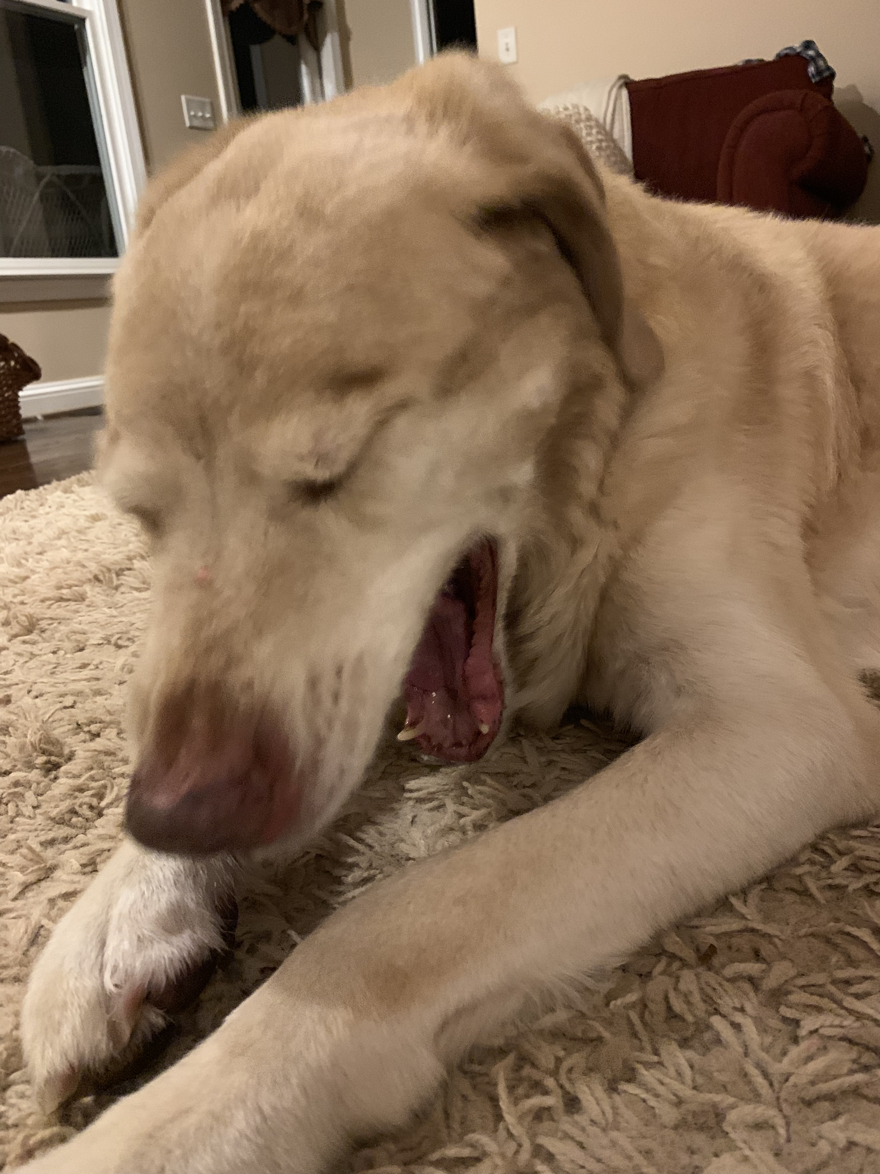 He teaches us persistence daily. The dog is incapable of making a decision but he is perfectly persistent in his indecisiveness. When you let him out, you will see him perched at the door literally seconds later begging to come back in. Once inside, he circles the den before standing beside the door with a look of desperation to go out. All of this in a span of 23 seconds. And it continues until he gets tired and falls asleep in a heap.